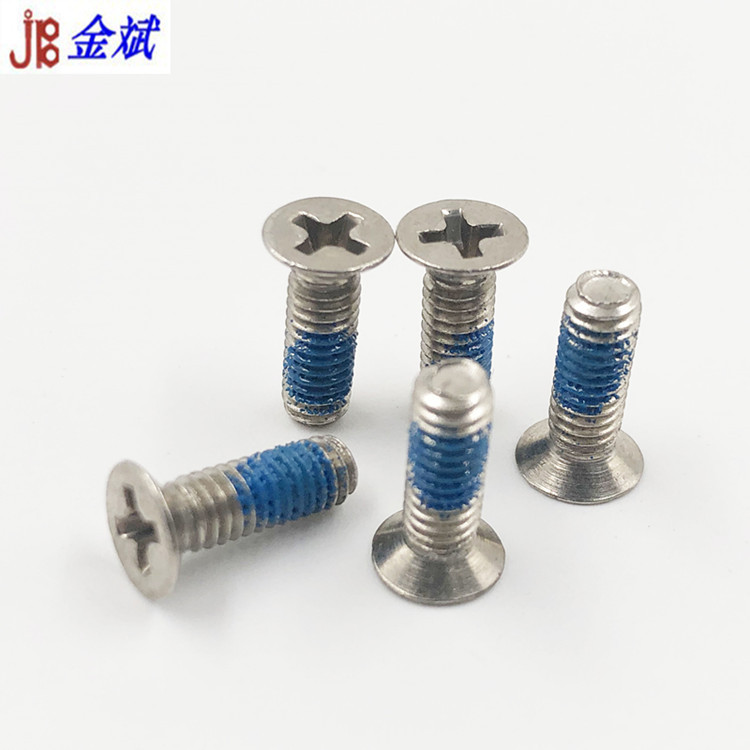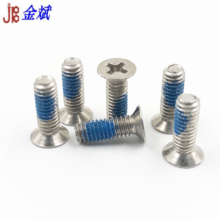产品详情:螺纹直径M=3.0mm;螺丝总长L=8.0mm,十字头径D=5.2mm,SUS304不锈钢标准硬度,点蓝色防松胶环保防锈盐雾螺钉,符合ROHS出口品质。